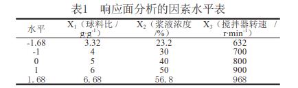 影響球磨機超微粉碎效果的主要因素有球料比、攪拌器轉速、枸杞子渣漿液濃度和粉碎介質。因此本研究以上述3個因素作為試驗因素,固定球磨介質為Φ10mm氧化鋯球,在單因素試驗的基礎上,通過響應面分析化佳工藝參數(shù),以粉碎后的顆粒粒度d50作為超微粉碎評價效果。